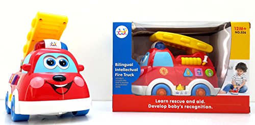 -. Feature : Bump & Go! fire engine It will change directions and run when it bumps into something / Colors stated are green, pink, orange, purple, blue, and yellow; Shapes are stated as cinquefoil, hexagon, heart, triangle, square, and circle / Button voices ambulance, police car, helicopter, fireman, policeman, ambulance man, and fire extinguisher / 3 AA batteries required (not included)