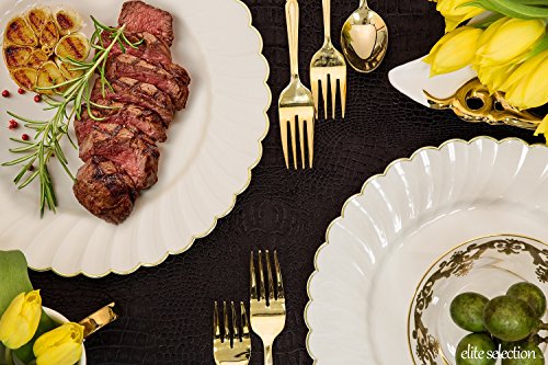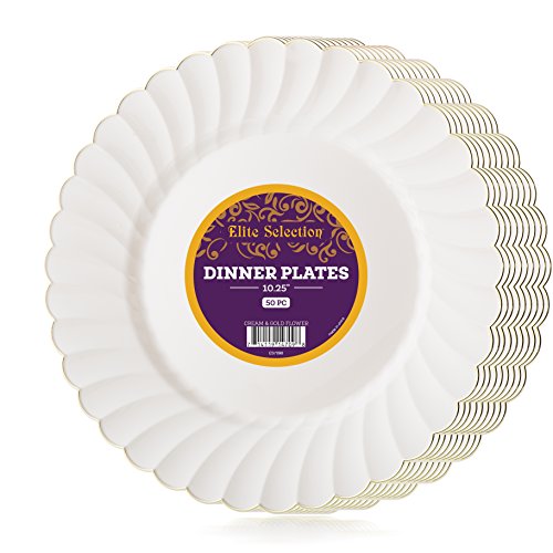 Elite Selection Pack of 50 Dinner Disposable Party Plastic Plates Ivory Cream Color With Gold Flower Rim 10.25-Inch