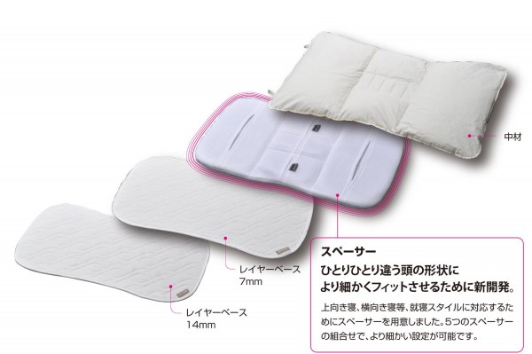 上向き寝、横向き寝、就寝スタイルに対応するためにスペーサーを用意しました。5つのスペーサーの組み合わせで、より細かい設定(左右・前後の細かな高さ調節)が可能です。 |