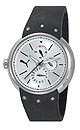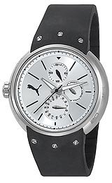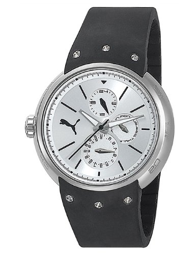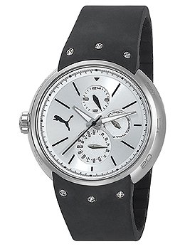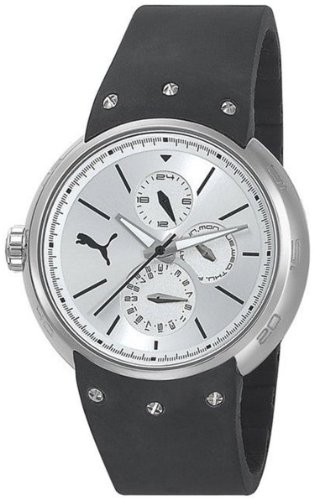 Casual watch, Quartz movement, Multifunction featuring 24-hour, day and date subdials, Polished silver-tone hands with white accents and gunmetal-tone sweep seconds, Polished gunmetal-tone hands mark subdials, Applied glossy black baton markers, Black print, Arabic numbers and indices mark subdials, Black hour markers and indices form surrounding minute track, Brushed silver-white dial with engraved black logo at nine o'clock, Matte black polyurethane strap with six polished silver-tone screws and brushed/polished silver-tone stainless steel buckle, Oversize polished silver-tone stainless steel round case with engraved Arabic numbers along edges, Textured steel crown with engraved logo, Stainless steel screw-down caseback, Mineral crystal, 5 ATM (50 meters/165 feet water resistant)Feature