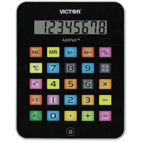 Features multicolored keys that are flush with the faceplate, similar to a tablet PC. Other functions include four-key independent memory, plus and minus key, square root key, and percent key. The large eight-digit LCD display and modern black and silver design gives it a stylish appearance. 9-1/2" H x 7-1/2" W x -1/2" D. Requires one "L1131" battery (included).