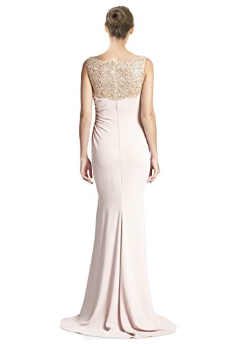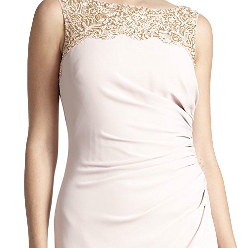 A ruched waist creates soft pleats on this column gown topped with an elegantly beaded yoke. Bateau neckline. Sleeveless. Beaded yoke. Ruched waist. Concealed back zip closure. Lined.