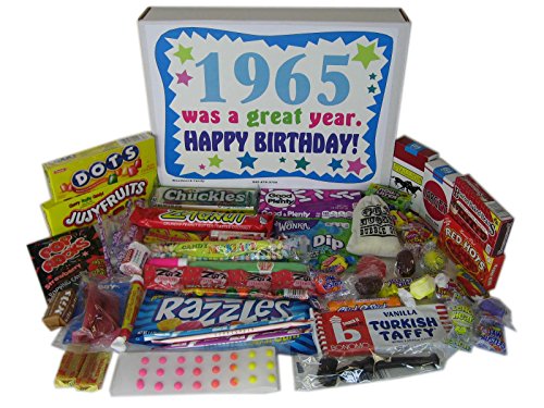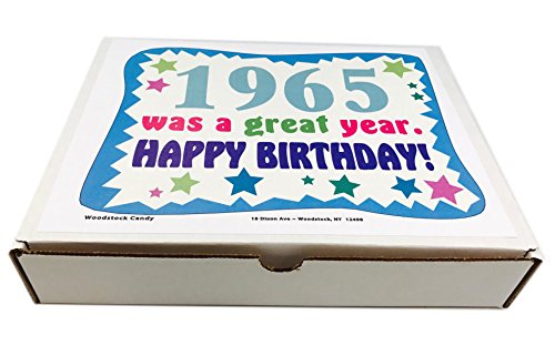 -. Binding : Misc. -. Brand : Woodstock Candy -. Feature : Contains forty kinds of retro nostalgic candy that a 52 year old will remember from their youth / 1965 Birthday Gift Box filled with nostalgic candy is sure to bring back fun memories / Makes a fun and unique birthday gift for someone born in 1965 / Everyone loves candy from their childhood / Comes shrink wrapped in a box that measures 11.75" x 9" x 2" -. IsAdultProduct : 0 -. Label : Woodstock Candy -. Manufacturer : Woodstock Candy -. PackageQuantity : 1 -. ProductGroup : Grocery -. ProductTypeName : GROCERY -. Publisher : Woodstock Candy -. Studio : Woodstock Candy -. Title : Happy 52nd Birthday Wishes Gift Idea - Retro Candy Gift Box for a 52 Year Old Man or Woman Born in 1965