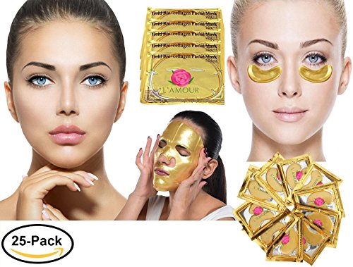 -. Feature : MOISTURIZING, SMOOTHING, AND PLUMPING EFFECTS OF L'AMOUR 24K MASKS: L'Amour's Premium 24k Gold Powder Collagen Facial Masks and Eye Patches deeply hydrate and increase the skin's elasticity, firm and tighten complexion, smooth wrinkles, rejuvenate and brighten skin tone, alleviate under eye bags, ameliorate dark circles, treat eye fatigue, decrease puffiness, and smooth crow's feet and fine lines with its unique blend of natural ingredients. / 5 FACIAL MASKS AND 20 PAIRS OF EYE PADS IN INDIVIDUALLY SEALED PACKETS: Our masks are especially designed for refrigeration, adding a concentrated dose of cold to decrease puffiness. We recommend refrigerating them for 1 hour before applying. / NATURAL INGREDIENTS SPEED UP CELL & COLLAGEN REGENERATION AND REPAIR: The central ingredients of the mask are taken from nature. These include 24k nano gold flecks, high density plant collagen, Vitamin C, Vitamin E, Provitamin B5, purified water, and hyaluronic acid. The composition of the masks is similar to that of human tissue. With high density plant collagen and transparent mask releasing technology, the ingredients are quickly absorbed by the skin, providing needed nutrients and moisture. / EASY TO USE: Wear L'Amour collagen masks 2-3 times a week for approximately 30 minutes to see effects. / MONEY BACK GUARANTEE: L'Amour offers a money back guarantee if you are not pleased with the product for any reason. Your satisfaction is our number 1 P.R.Iority. Contact us any time with questions.