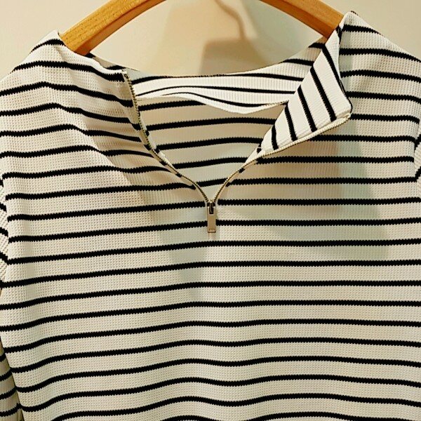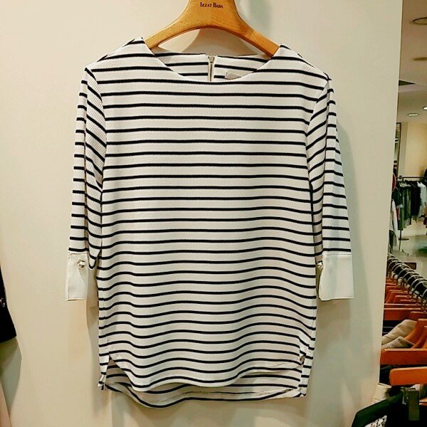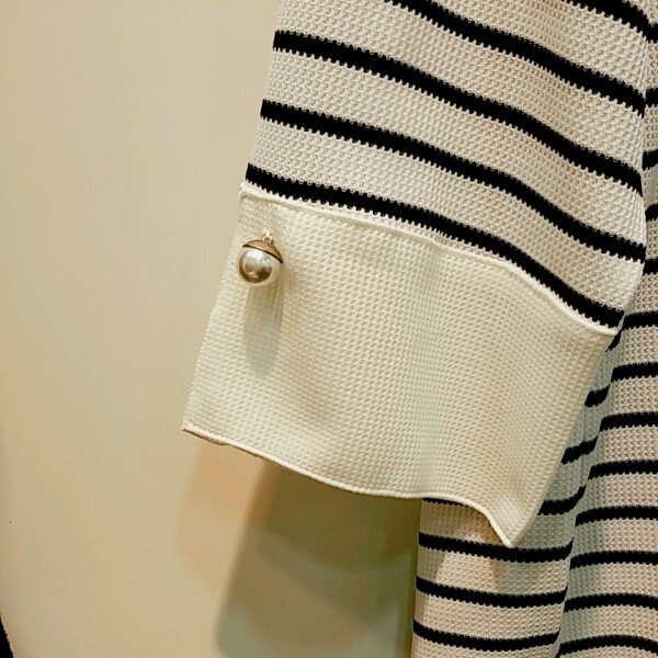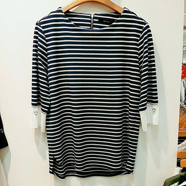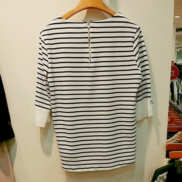 기본 스트라이프 7부 티셔츠에요~ 신축성이 좋아서 무지 편해요~ 사이즈는55,66 두사이즈 나오구요~ 반인치씩 여유있어요~ 총장은 중?아래구요~ 살짝 A라인이라 배부분 커버도 되서 편하실꺼에요~~ 화이트도 스킨톤 속옷 입으시면 많이 비치지않아요~