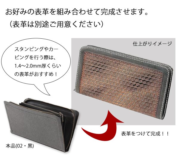 仕立て済みの中パーツにお好みの表革を組み合わせて完成させます。スタンピング・カービングを行う際は1.4~2.0mm厚くらいの表革がおすすめです。 |