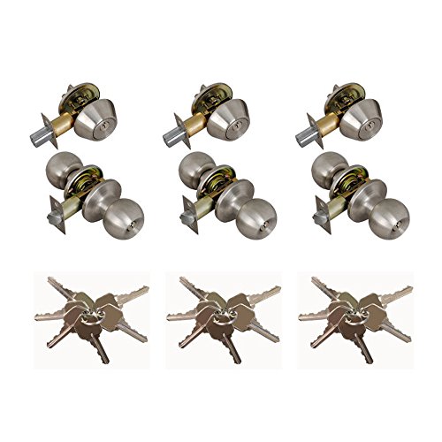 Grip Tight Tools ED06-3 Combo Entry Lock Set Door Knob with Double Cylinder Deadbolt Keyed Alike Keyway (Set of 3), Silver, 3 Piece