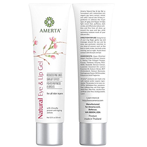 AMERTA Natural Eye and Lip gel is formulated with antioxidant-rich organic goji berry extract, retinol, and other natural skin-firming ingredients to address the major signs of aging and fatique. It helps fighting crow's feet, puffiness, dark circles, and effectively reduces wrinkles and fine lines that show up around eyes and lips, while regulating moisture levels of your delicate skin. The product is suitable for all skin types.