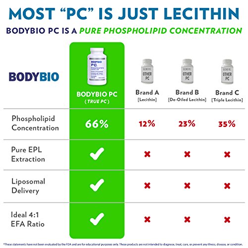 -. Feature : IMPROVED MENTAL FUNCTIONING Approximately 60% of the brain is fat, replenishing with fatty acids such as Phosphatidylcholine (PC) is essential for proper mental functioning.* Low levels of PC in the body impact the brain and heart, affecting memory, mental alertness, motor skills, behavior, and focus. * / ESSENTIAL FATTY ACIDS A proP.R.Ietary blend of essential fatty acids linoleic acid (LA), alpha linoleic acid (ALA) and minor fatty acids in a concentration of 66% phospholipids with the highest one being Phosphatidylcholine (PC). / PURE PHOSPHOLIPIDS BodyBio Phosphatidylcholine (PC) is made of pure phospholipids that have been demonstrated to improve neurotransmitter efficiency and revive cell membrane fluidity. * Phospholipids such a PC form approximately 50% of the cell membrane. * / UNIQUE FORMULATION Formulated in a 4:1 ratio of Omega 6 and Omega 3, as endorsed by The World Health Organization the optimum balance of EFAs. * A BodyBio Exclusive. / 1300 mg Phospholipid Complex per 2 softgel serving. Derived from Soy (Soya) Lecithin. Non-GMO tested and verified. Halal Certified.
