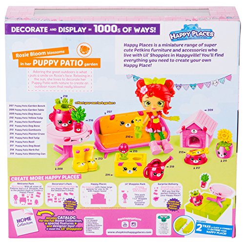 Adoring the great outdoors is what puts a smile on Rosie’s face. Relaxing in the sun, she loves to decorate her Puppy Patio with nature to create an outdoor room that really blooms! • Welcome Packs are a great way to play and decorate! Everything you need including a themed Lil Shoppie to match your room! • Happy Places Welcome packs contain one Lil Shoppie, * Heaps of cute Petkins to decorate your Happy Place, 2 tiles and 1 catalog.Feature