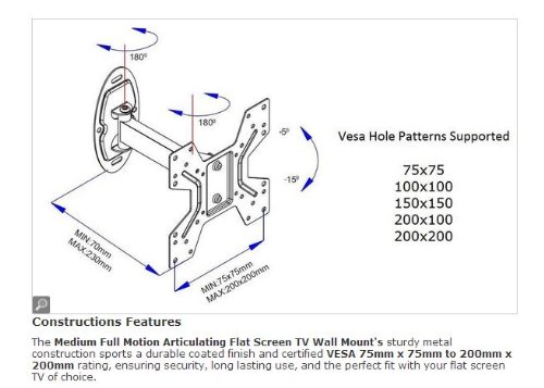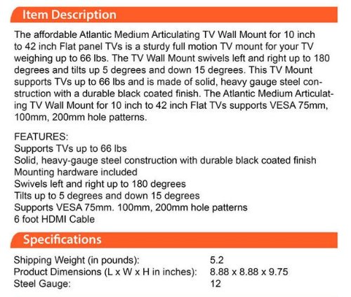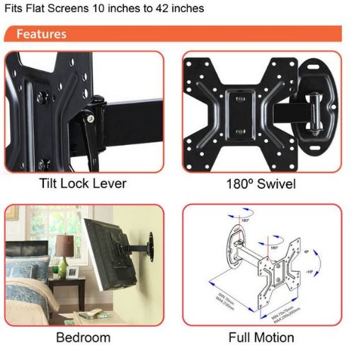 - Feature : Fits 10" to 42" flat-panel TVs / Includes Bonus 6 foot HDMI Cable / Solid, heavy-gauge steel construction with durable coated finish / Articulates out from wall 2.76" minimum, 9.75" maximum / Tilts up 5 degrees and down by as much as 15 degrees