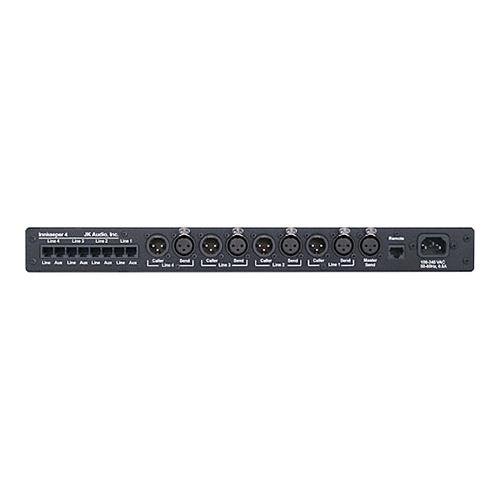 Studio : JK Audio Publisher : JK Audio Binding : Electronics Product Description The Jk Audio Innkeeper 4 Multi-Line Digital Hybrid squeezes four independent digital hybrids in a 1U rack space. The front panel keypad, display and handset jacks provide easy speed dialing and call setup. Digital hybrids allow you to send signals into the phone line while maintaining excellent separation between your voice and the caller. The balanced XLR output jacks contain only the caller's voice. It connects audio signals to standard analog telephone lines without the transmit / receive crosstalk common to analog hybrids. The Digital Signal Processor (DSP) continuously monitors both the phone line and audio signals to deliver excellent separation. This proprietary, dual-convergence echo canceller algorithm can achieve excellent separation, typically exceeding 50 dB, without any setup and without sending a noise burst down the line. The menu driven keypad and back lit display allow you to store 50 phone numbers by name in a phone list. You can also use the display to set features such as the number of rings before auto answer, master send channel selection and test tone output. An auxiliary telephone jack is provided for each line. The auxiliary telephone is disconnected when you press the "Call" button and reconnected when you press the "Drop" button. It features Auto-Answer/Auto Disconnect for use in IFB and monitoring applications. Other applications include: telephone interviews, talk shows, church PA interface and conference room full duplex appl 0