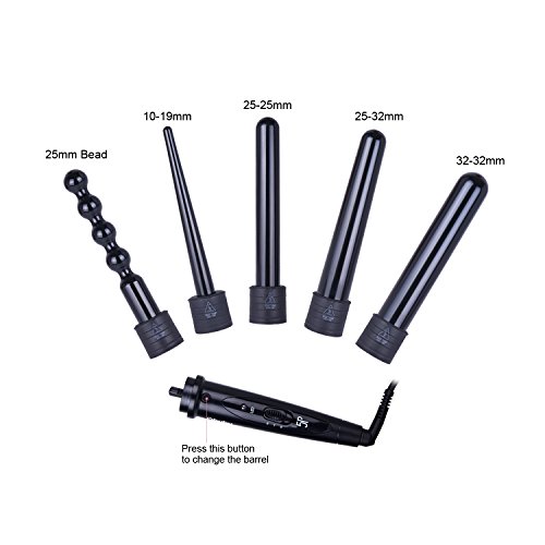 5 INTERCHANGEABLE BARRELS FOR ALL CURLS: Easily create different curl types for a bouncy, wavy hairstyle that's never the same. Conical 0.37-0.75 inch, Conical 0.98-1.25 inch, Cylinder 1 inch, Cylinder 1.25 inch, Bubble 0.98 inch.