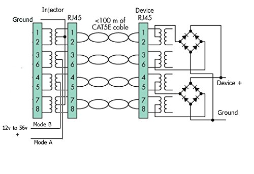 These devices share power and data on either 2 or 4 pairs in the ethernet cable. Mode A DC input provides power on the data lines 1 and 2, and 3 and 6. Mode B DC input provides power on the data lines 4 and 5, and 7 and 8. Use both for 802.3at operation (jumper cable included). All devices receive the same voltage - choose a power supply with more available power than the total all devices. Check device specs for power needs, it is under 4 watts for most Phones, other devices need more