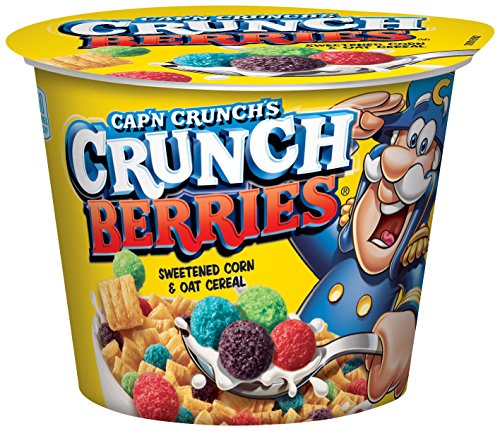 Cap'n crunch's crunch berries cereal cups are a convenient and easy way to get going in the morning. Enjoy the crunchy sweetened corn and oat biscuits with delicious fruit flavored berry shapes with our single serve cups. Each spoonful of cap'n crunch's crunch berries cereal cups combines sweetened corn and oat biscuits with delicious fruit flavored berry shapes. Fortified with seven essential vitamins and minerals, it provides a balanced breakfast you can feel good about eating when paired with low-fat milk and fruit or a glass of 100% juice.Feature