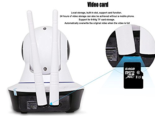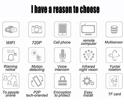 -. Feature : WIFI, Smart Link, Plug & Play, Easy monitor by mobile phone,720P 1.0MP HD monitoring pictur / Support Motion Detection,3D Audio Processing Technology to ensure high-quality cal / Support remote control via APP, Pan-Tilt can rotate to monitor all round. / Support max 64GB SD card for local video storage / Support 64 channels PC CMS software,Onvif compatible, can connect with NVR to record with larger capacity
