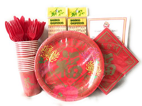 Chinese New Year / Lunar New Year / Spring Festival Party Supplies for 16 Guests – Red Plates, Napkins, Cups, Chopsticks, Forks, Spoons, Knives in Good Luck Theme