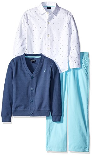 Nautica Boys' Long Sleeve Button Down Shirt, Cardigan and Flat Front Pant Three Piece Set, Ink, 3T