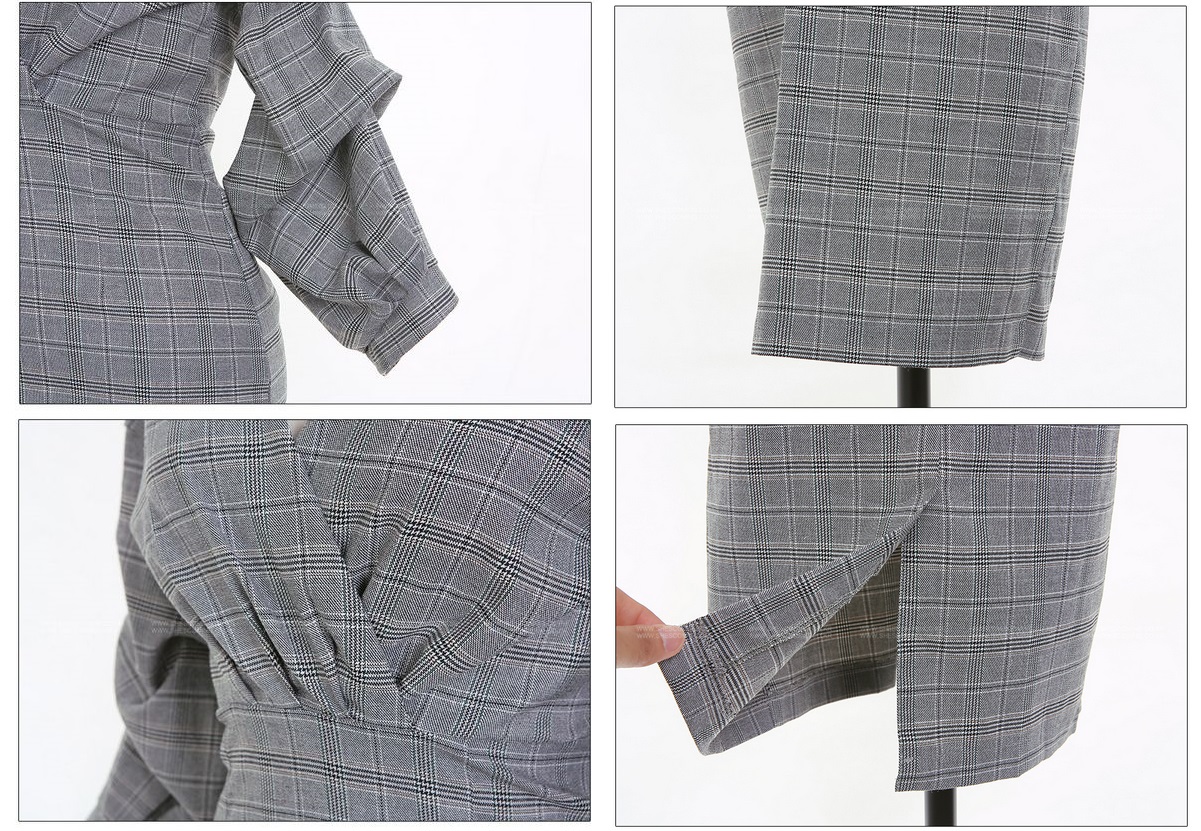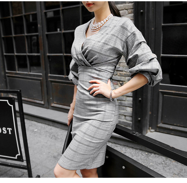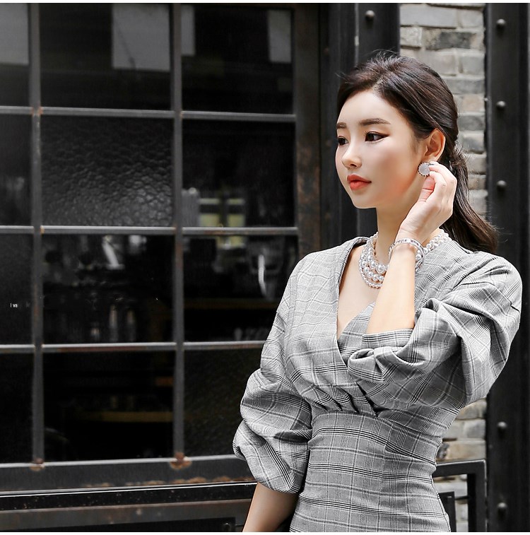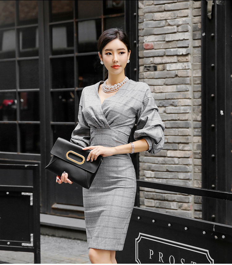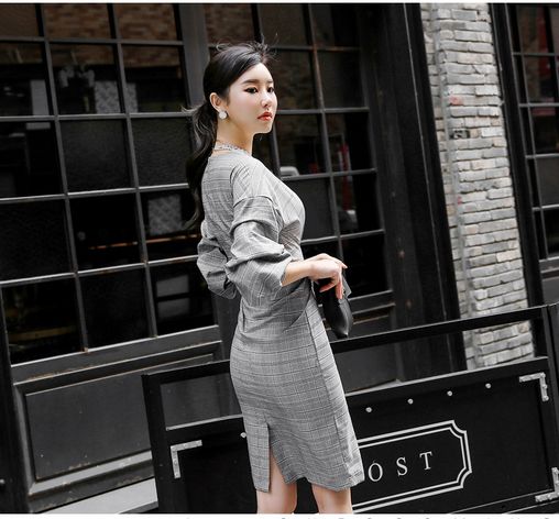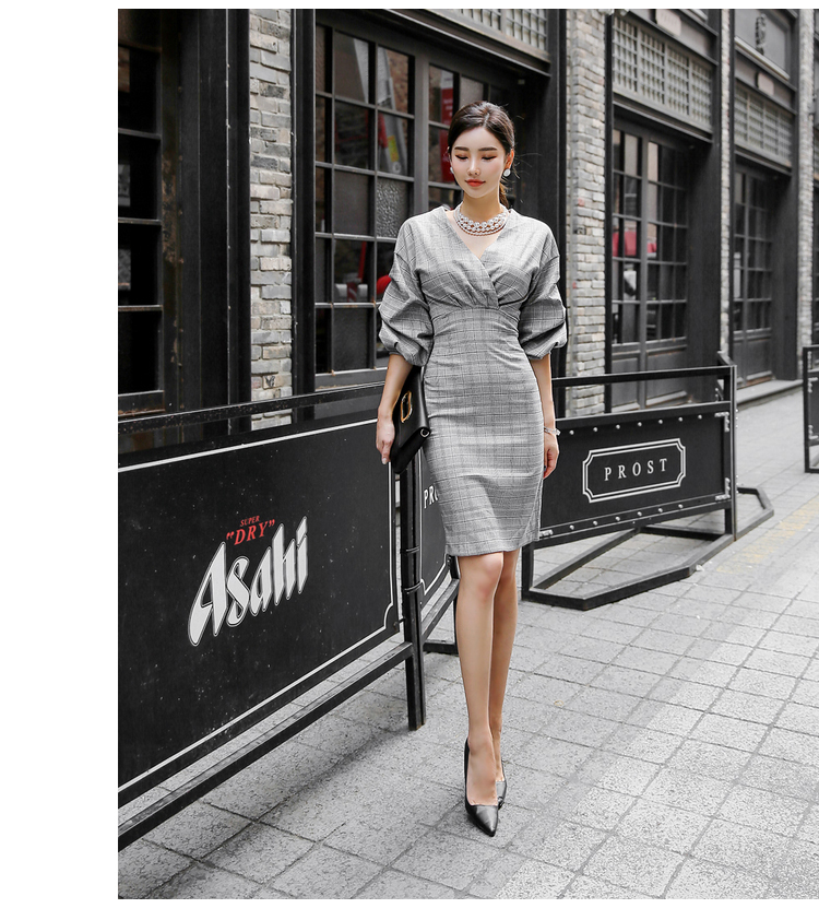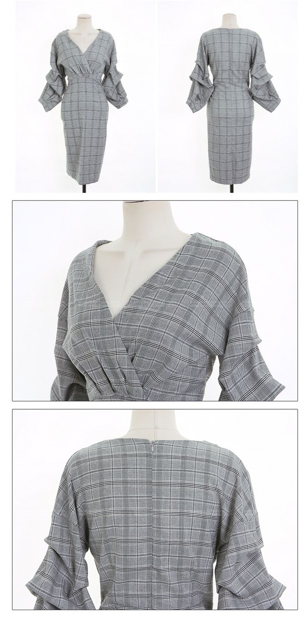 デコルテが美しく見えるVネックとタイトなデザインで、フェミニンな大人女子を演出します。