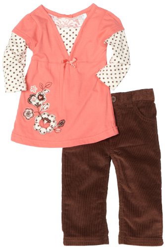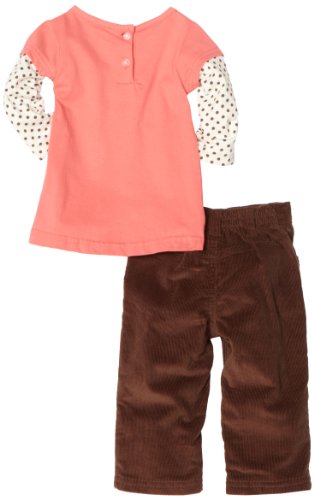 -. Feature : Pastel orange v-neck twofer top with polka dot sleeves and flower applique in corner, brown corduroy pant with functional pockets to match / Brown corduroy pant with functional pockets to match