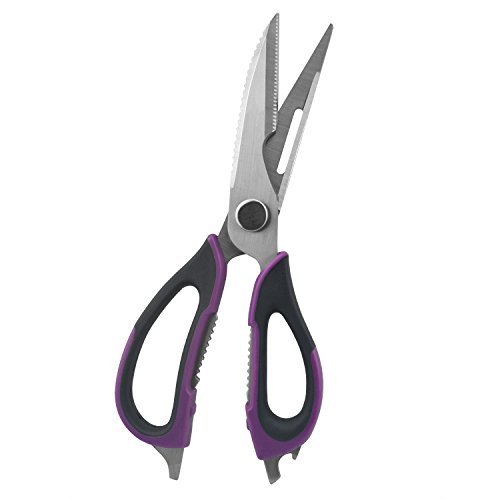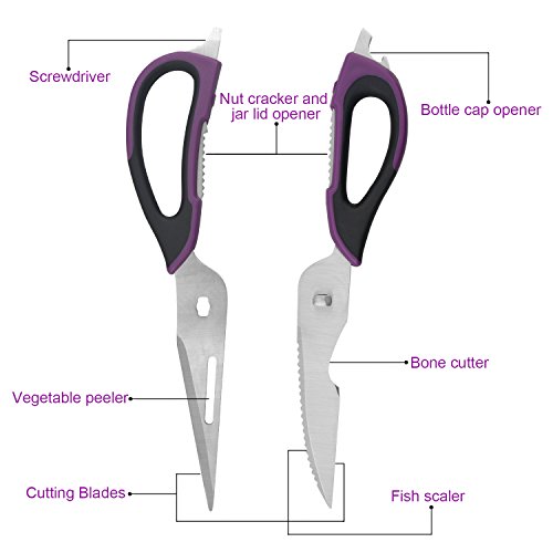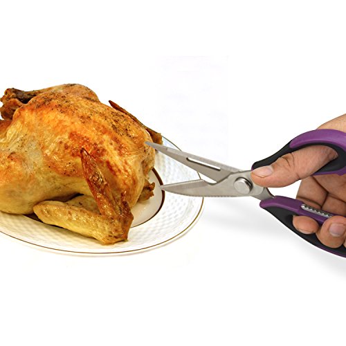 - COMFORTABLE EASY GRIP HANDLES. Great grip for both right and left handed chefs, these comfortable and super sharp scissors will make food preparation easier and faster, The plastic blade guard can protect the blades from damage and avoid hurting your hands.