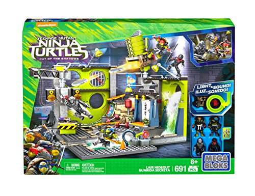 -. Feature : Buildable, customizable, Lair Hideout with four unique areas and character-specific themes / Dynamic display features include shock sensor-activated LED lights and sounds, retractable crane zip line, and revolving wall with hidden katana / Includes sewer cap launcher with shock sensor-activated sounds and sewer cap accessories / Four buildable, fully detailed micro action figures include Leonardo, Raphael, Shredder, and a Foot Soldier, each with movie-inspired themes and accessories / Combine with other Mega Bloks Teenage Mutant Ninja Turtles: Out of the Shadows sets and build your own movie brawls