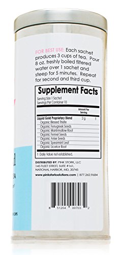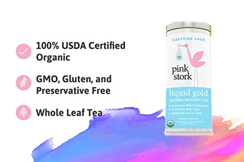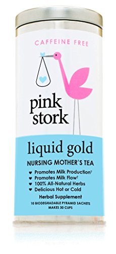 Pink Stork Liquid Gold tea is the perfect addition to your post-natal nutrition routine. Nursing can be problematic for many women, particularly in the beginning. Liquid Gold tea not only contains herbs that can help boost milk production and flow, but can also help provide quick relief to both nursing moms and colicky or "gassy" newborns. Liquid Gold tea is soothing and relaxing for both mom and baby. Pink Stork Liquid Gold is made from 7 scientifically selected organic non-GMO herbs including galactagogues, which are demonstrated to improve milk supply, milk flow, and to provide breastfeeding support. Enjoy large portions of organic Blessed Thistle, Fenugreek, Marshmallow Root, Fennel, Anise, Spearmint, and Licorice, herbs that are proven to promote milk flow and milk supply while alleviating digestive issues. Delicious taste and slightly sweet. Your baby will love the taste, which will encourage healthy nursing habits. To make your relaxing cup of tea, simply boil 8 oz. of water and pour over a biodegradable sachet of Pink Stork Liquid Gold. Steep the sachet for five minutes and enjoy. Alternatively, use a few sachets of Pink Stork Liquid Gold in a full teapot for consumption throughout the day. Each sachet is vacuum-sealed and biodegradable and is free of glue and staples that are commonly found in traditional tea bags. Each sachet produces 3 cups of tea so you can rest assured your Pink Stork Liquid Gold tea lasts much longer than your traditional tea bags. -Includes our Program Overview. -Organic herbs -Non-GMO -Free from glue & staples -Risk-free with our happiness guarantee. Order your Pink Stork Liquid Gold today to help boost milk production and flow, soothe your colicky baby, and improve nursing frequency and duration!Feature