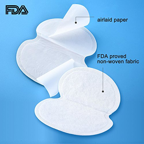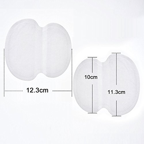 Sweat pads are made of FDA proved non-woven fabric (top layer) and airlaid paper (back layer), gentle to your skin, suitable for most skin types. Each pad size is 12.3 x 11.3 cm, proper size for placing on armpit area, provides secure placement to most fabrics including silk.