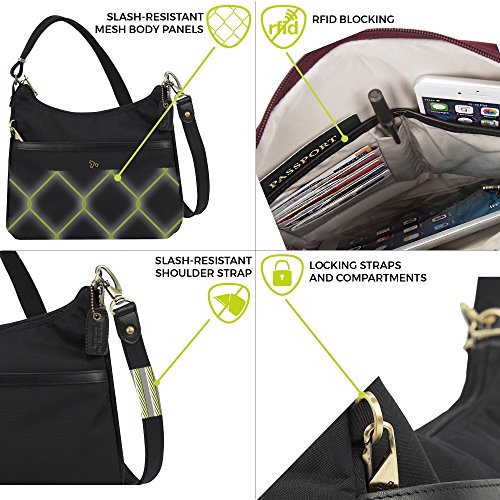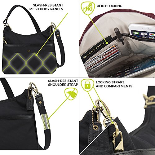 Studio : Travelon Publisher : Travelon Binding : Apparel Product Description This elegant statement hobo is deceptively versatile as a travel or daily companion bag. Featuring an intelligent organization compartment with RFID blocking card and passport slots, an open top wall pocket, a zippered wall pocket. The easy access, locking front zipped pocket, and rear snap-close pocket are perfect of a phone or quick grab items. Anti-Theft features including slash-resistant const 0