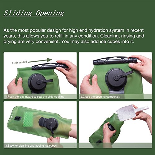 -. Feature : As the most popular design for high end hydration systems in recent years, this allows you to refill in any condition. Cleaning, rinsing and drying are very convenient. You may also add ice cubes into it / Anti-bacteria material. Patented GlassAS technology makes it a high smooth interior surface. The smoothness of the liner prevents the germ and the lime from adhension, which promotes health / Might be the most rigid hydration bladder on the market: 0.6mm extra thick liner is pressure-tolerant and wearproof; double soldering sealing side technique has greatly improved durablity / Patented mouth piece and hose connector: Anti-microbial mouth piece, high flow, auto-lock function to prevent leaking, comes with dust cover. Selflock connector allows you to unhook the tube quickly without any leaking / Capacity: 50 oz / 2 litre Options.The whole system is made of food grade material and is SGS and FDA certificated. 6.7"(W) x 13.7"(L) inches