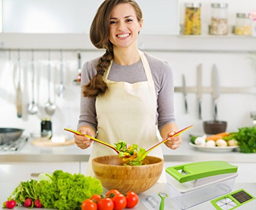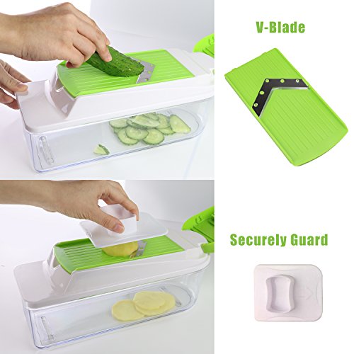- ★ SAVE TIME AND EFFORT- THIS MANDOLINE FOOD SLICER WILL CUT YOUR PRE TIME IN HALF ! Easy to use , Only with a fast lid-closing motion, Make work of preserving food / Salad and Canning super fast ; Chop, Slice ,Dice, Cut, Stick or Shred in one easy swift motion. Great for Vegetables, Onions ,Potato, Cucumber, Garlic, Cheese, Fruit,Salad & More.