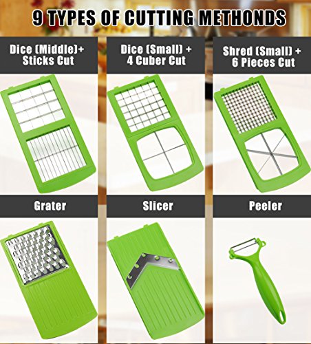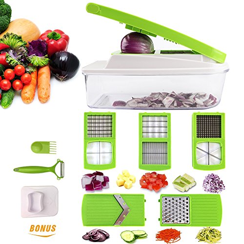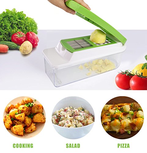 - ★ 12 IN 1 MAGIC SLICER -MULTIPURPOSE FOOD PREP TOOL– Manual vegetable chopper dicer, Julienne slicer, Onion chopper dicer (big/middle/small cubes),Shredder,Grater, Fruit/ Vegetable Cutter - 8 Types stainless steel blades for slicing/ dicing/ grating/ chopping / julienne / cuber cutting. A great all in one kitchen chopper for home kitchen cooking.