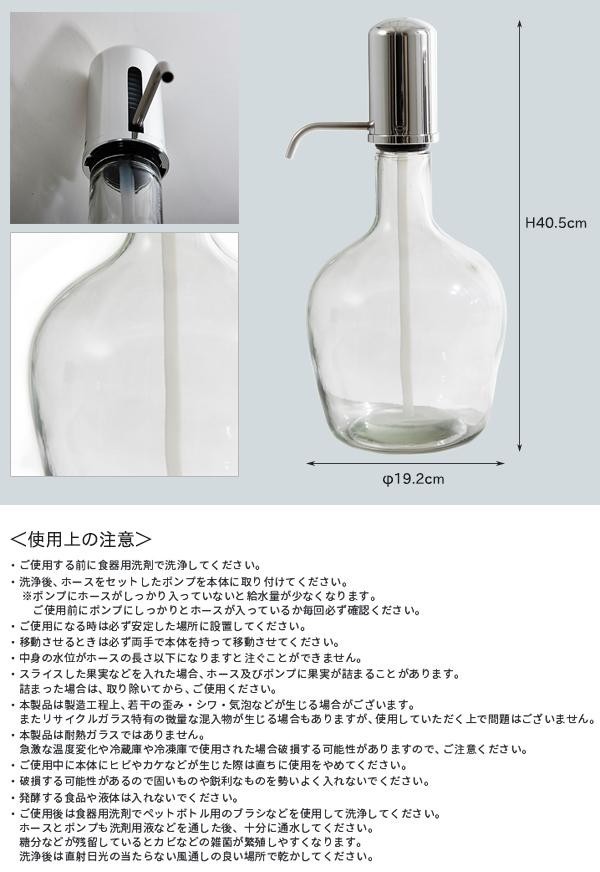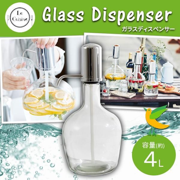 レモン水やサングリアなどを手軽に自宅でオシャレに楽しむことができるガラス製のディスペンサー。上部のコックから、欲しい量だけ飲み物を注ぐ事が出来ます(ワンプッシュで約40~50ccの水をくみ上げることが出来ます)。蛇口(コック)が下にあるタイプのものと違い、ポンプで組み上げるタイプなので土台やホルダーが不要!テーブルなどでも場所を取りません。 |