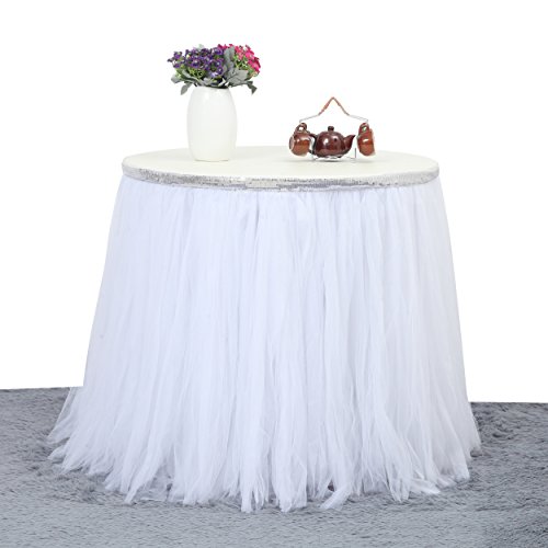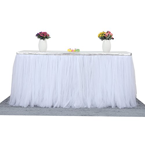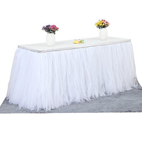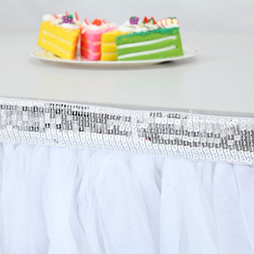 Suppromo 1 Yards Gold Brim Fluffy Tutu Talbe Skirt Tulle Tableware For Party,Wedding,Birthday Party&Home Decoration (L 3(ft)H 30in, Silver White)