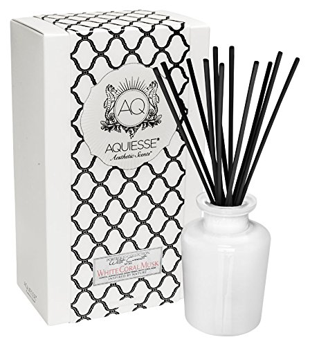 Studio : AQUIESSE Publisher : AQUIESSE Binding : Kitchen Product Description White collection Reed diffuser 9.5 fl oz./287 ml. Sweet coastal Jasmine, Savory sage and White coral musk with notes of bleached ocean timber easy seaside living. Stunning White glass with decorative stopper and dark fiber reeds. Handcrafted in the USA. 0