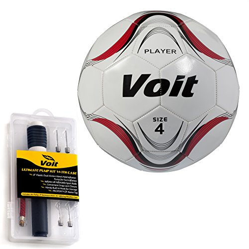 Studio : Voit Publisher : Voit Binding : Sports Product Description The Player Size 4 Soccer Ball is a great choice for practice or play. The ball has a butyl bladder for superior air retention and the clean white and red graphic stays looking good long after the season is over. Also included in this package is Voit's Ultimate Pump Kit. The Voit Ultimate Pump Kit includes 1- 8" dual-action hand-held air pump for fast inflation, 1- 4" Extension Hose, 6- Inflating Needles and a handy storage case. The dual lock storage case includes a built in hook for hanging in the garage and a "Property Of" name tag molded right into the back. 0