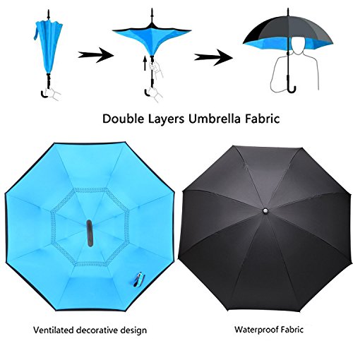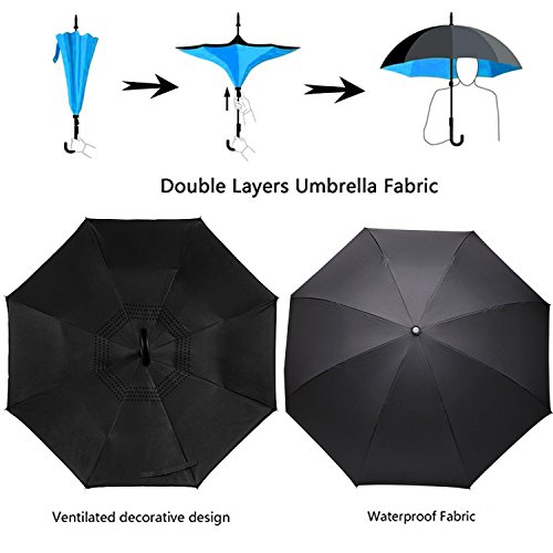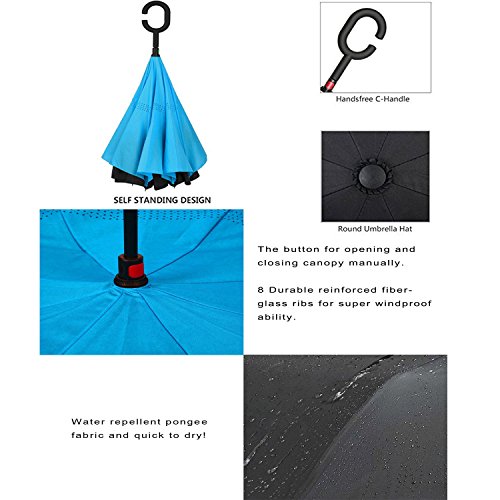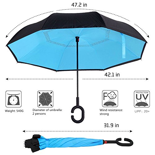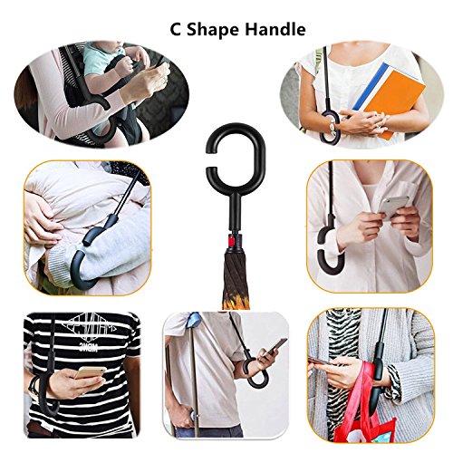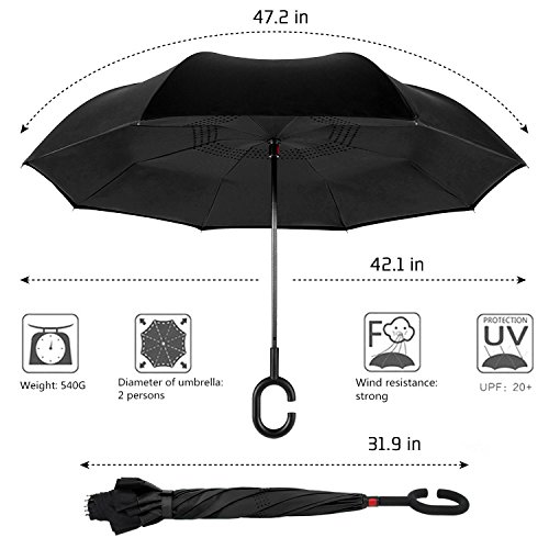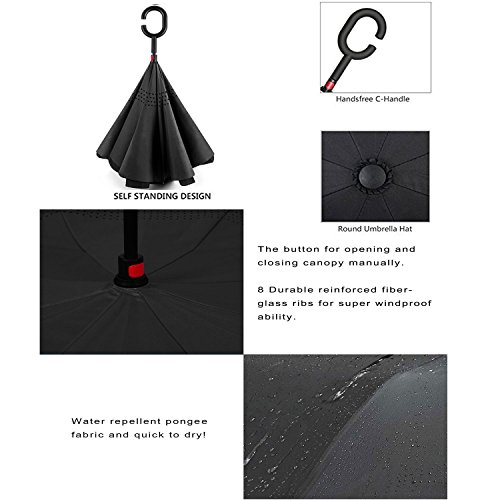 -. Feature : Durable Material: Made of light and waterproof pongee fabric. Breathable double layer canopy and smooth top, using a high-quality stainless steel frame, so the body is firm and able to withstand strong winds. / Inside-out Design: Reverse folding umbrella design concept. You can open this inverted umbrella as you open the door or car and not get wet. When closed, the wet side of umbrella becomes inside with the dry side exposed, so there are never wet your clothes, car, floor, bag etc. / C-shape Hand Grip: Cross the C-shape handle over your arm, made your hands free for holding a baby, bag or mobile. / Innovative Inverted Umbrella Stand: The eight steel balls of the frame are transformed into eight legs upon contracting the umbrella, which can stand up on its own. Ideal for when you have nowhere to prop your umbrella up against. / 90 DAYS REPLACEMENT GUARANTEE: Mobarta stands by the high quality of our products, and buyers are automatically enrolled in our 90 days replacement program. If anything goes wrong with your product within 90 days of your purchase, let us know and we will send you a replacement - absolutely free!