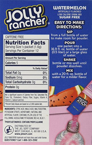 3- Three (6-ct.) Box of JOLLY RANCHER Watermelon Flavor Singles to Go! Instant Sugar Free Drink-Mix. Add to 16.9 oz. bottled water. ~Phenyleketonurics: Contains Phenylalanine~ Listing was Created by: Avoca Auctions, Please Contact us with any questions about this product Brand : Jolly Rancher EAN : 0072392337989
