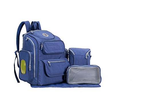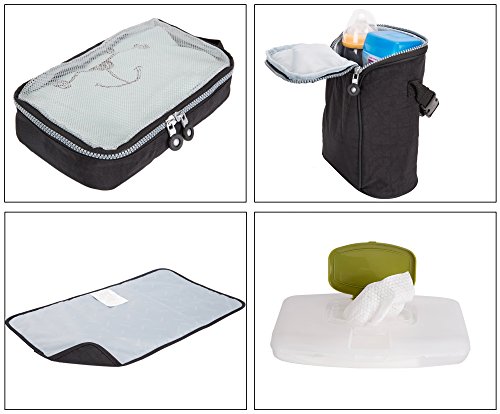 5 pieces set of diaper backpak: 1. Extra roomy main compartment with over 12 multipe exterior and interior pockets, Reliable zip-top closure. 2. This backbag also come with the stroller attachment. It easily Hangs on a stroller for busy mom on the go. 2. Matching Padded Changing Station, 3. Multi-purpose function mesh bag for clothing, snacks or others stuffs. 4. Translucent wipes case see through for your reloads. 5. Extra Large Insulated zippered Bottle bag wth Handle, It can be attached to the Stroller. This can also fit at least 3 most standard bottle.