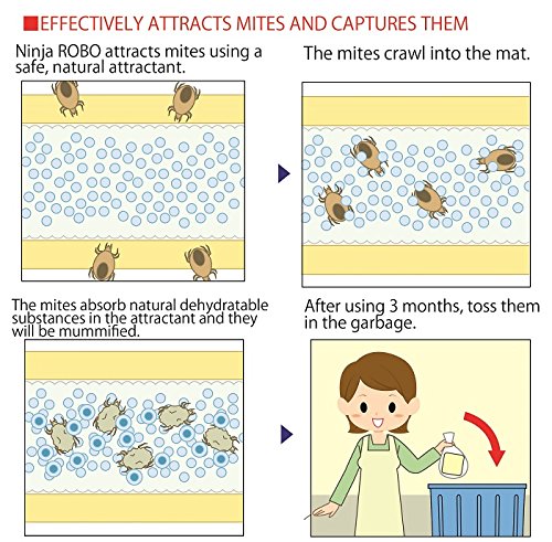 Ninja ROBO attracts mites using a safe, natural attractant. The mites crawl into the mat and absorb a non-toxic ceramic substance through the mouth or respiratory system, which dehydrates and captures them. As the mites are captured alive, their droppings or carcasses are not scattered.