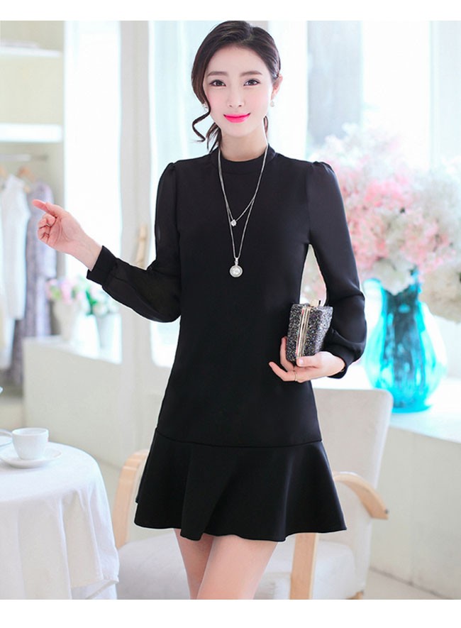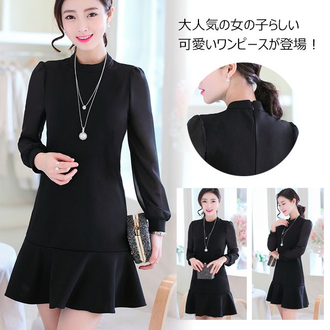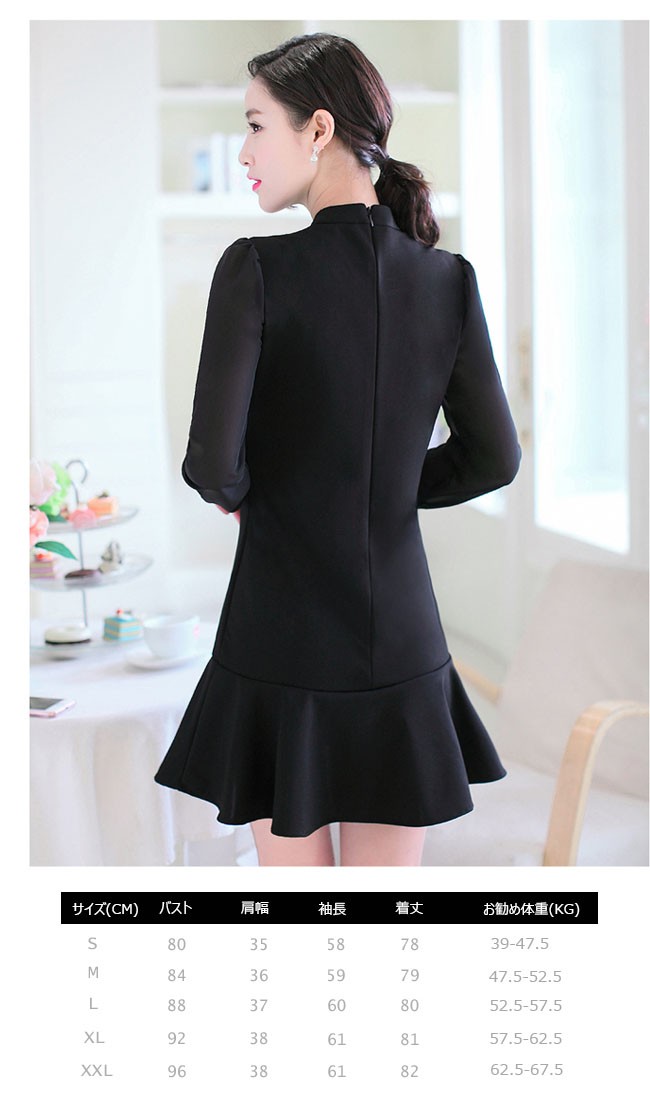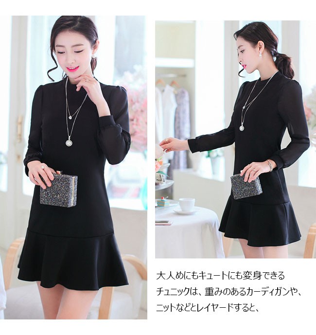 | 商品名 | 長袖ワンピース ミニ丈ワンピース インナーワンピース レディース ショート丈 レース切り替え フレア 無地 ブラック ゆったり 体型カバー フェミニン |