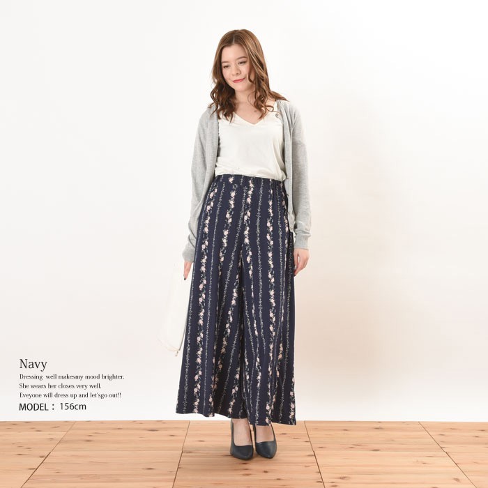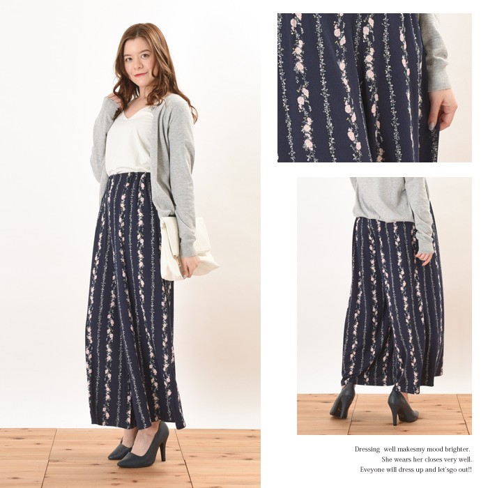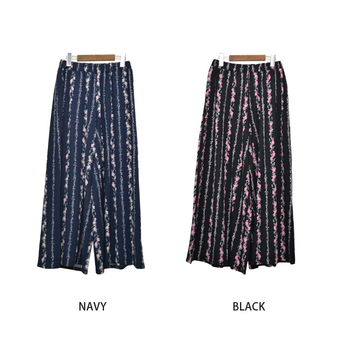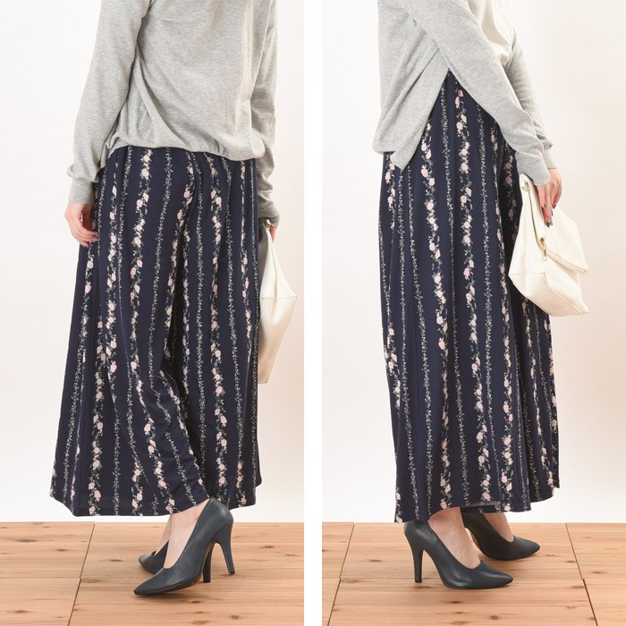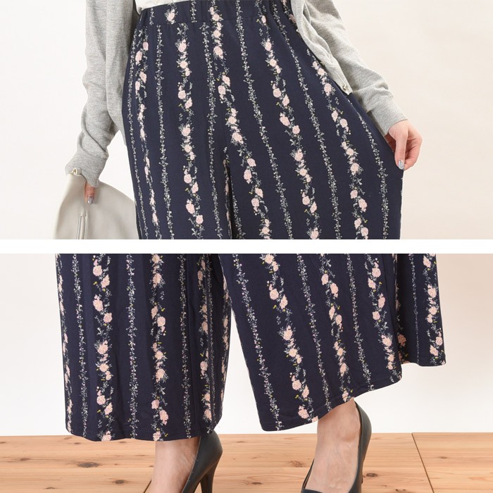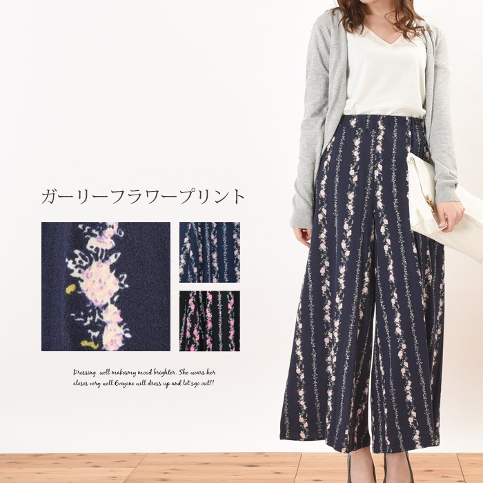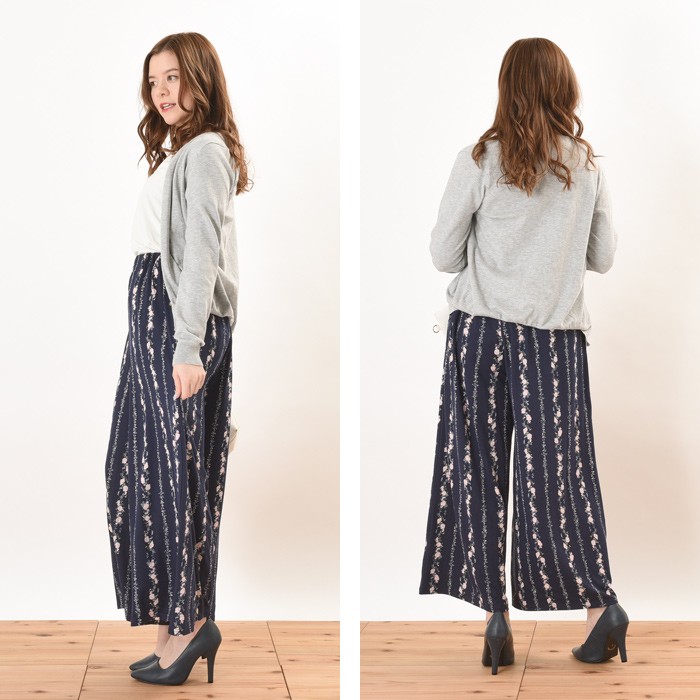 さらっとしたさわり心地が滑らかで、しっかりとした生地感のピーチ素材のワイドパンツです。インパクト満点でガーリーな雰囲気のある花柄がオシャレなデザインです♪シンプルなトップスやアウターと相性抜群なので、幅広いコーディネートのワンポイントとして取り入れられます♪また、ゆったりとしたシルエットで体型カバーもしっかりとできるので、着心地楽ちんです♪ウエスト部分には、ゴムが入っていてストレスフリーに着れます。Mサイズ Lサイズ