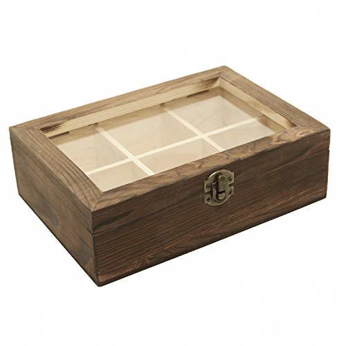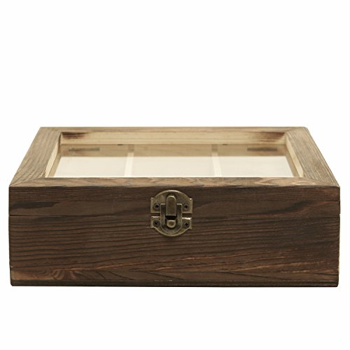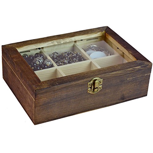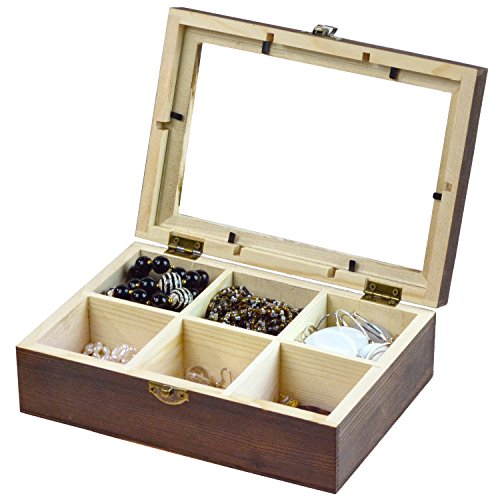 MyGift 6 Compartment Shadow Box, Craft & Jewelry Storage Case w/ Glass Lid and Latch Lock, Brown