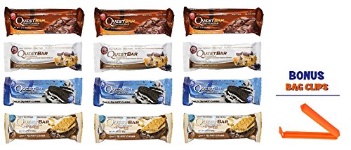 -. Title : Quest Nutrition Protein Bar, Variety Pack With Free Bag Clips,(Pack of 12), 3 Chocolate Brownie, 3 Chocolate Chip Cookie Dough, 3 Cookies & Cream, 3 S`mores