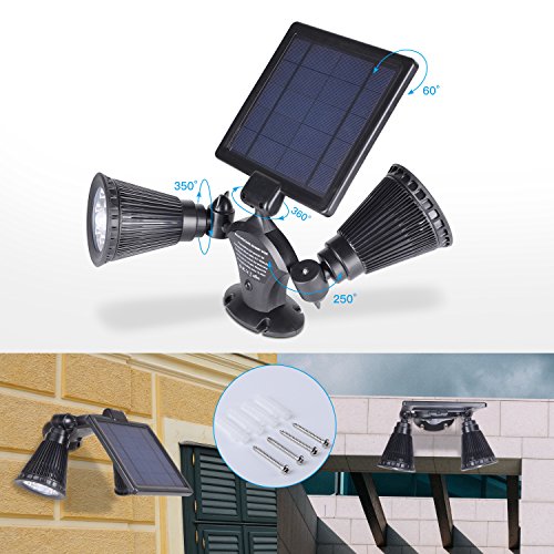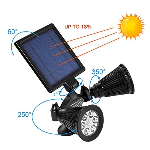 【Double 360 degree Swiveled Solar Security Spotlights】Double lamps on the two sides of the solar spotlights with 6 LED*50 Lumen in each one. No darkness dead corner with 60°solar panel and twin 350°rotatable spotlights. It can be independently flexibly rotated, and set lighting to any angle you want.