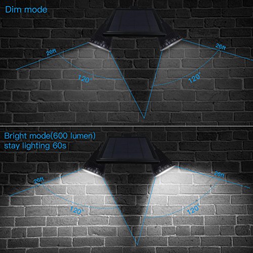 【Sensitive PIR Motion Sensor】Build-in PIR Motion Detection Sensor, this solar lights can detect up to 20ft away, range 120 degree, bright mode(600LM) turn on for 60s after the motion detected, then turn to DIM mode.
