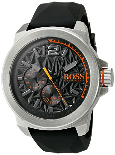 NEW YORK SERIES: This Hugo Boss watch has a color coated stainless steel case 50mm in diameter and is fitted with a leather strap. Inside the case lies a quartz movement and the watch features a mineral crystal.