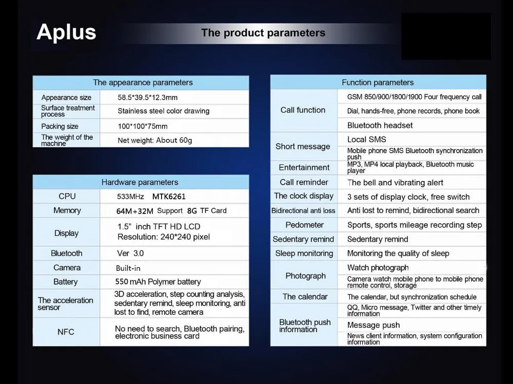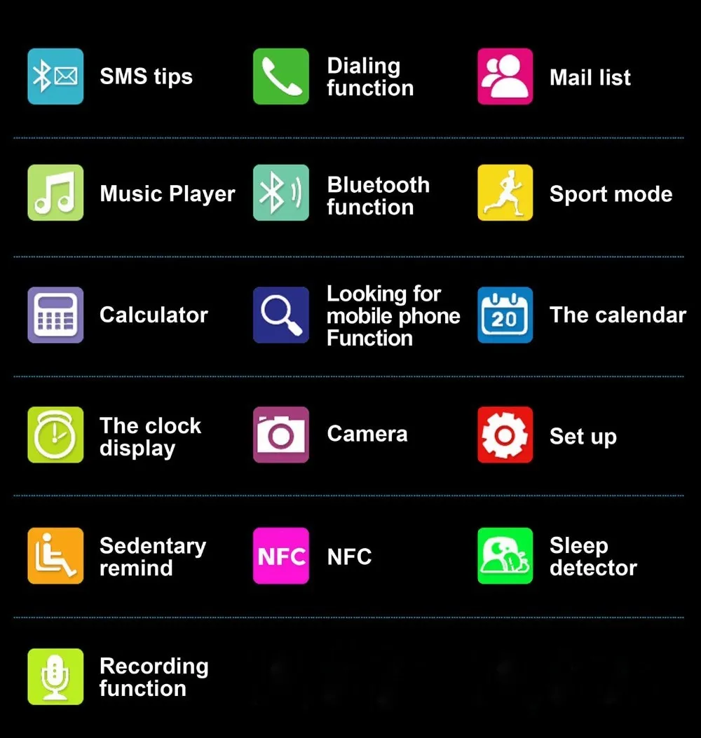 Function:Answer Call,Remote Control,Dial Call,Passometer,Message Reminder,Sleep Tracker,Call Reminder,Fitness Tracker