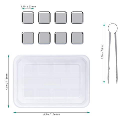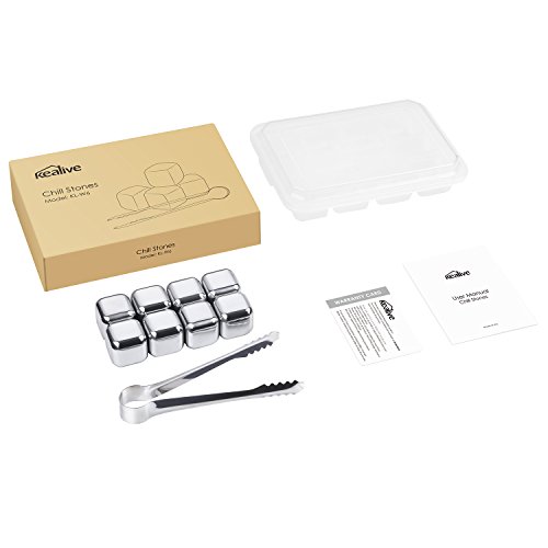 -. Feature : 8 Ice Cubes Ready When Needed: Save money and time with reusable ice cubes that are always ready when needed. The rounded corners won't scratch the glass or hurt you while drinking / Premium Quality & Reliable FDA Certification: Made of FDA certified food grade stainless steel, eco-friendly and BPA free, tasteless and non-reactive, preserve the original flavor of your drinks. Meanwhile, their glossy appearance and pretty smooth surface make themselves easy to clean / Free Tongs Included: Simply use the included tongs to easily pick up the whiskey stones and place them into your glass. No more awkwardly pressing your thumbs against the ice tray to pop the ice cubes out while trying not to miss your drink / Free Ice Tray For Easy Storage: Including an ice tray to store your cooling cubes in the freezer and keep them neat and clean thanks to the protective lid. And you can also use it to make ordinary ice cubes if the situation calls for it / Package Content: 8×Kealive Whiskey Ice Cubes, 1×Ice Tray, 1×Tongs, 1×User Manual, 1×24-Month Warranty Card