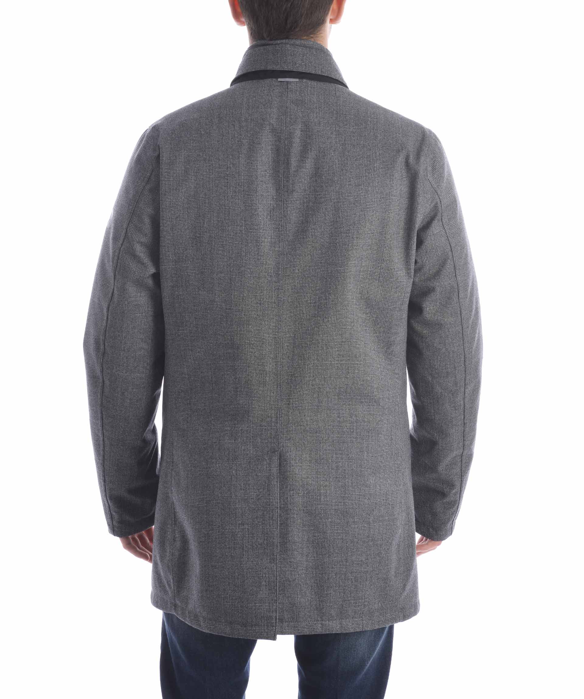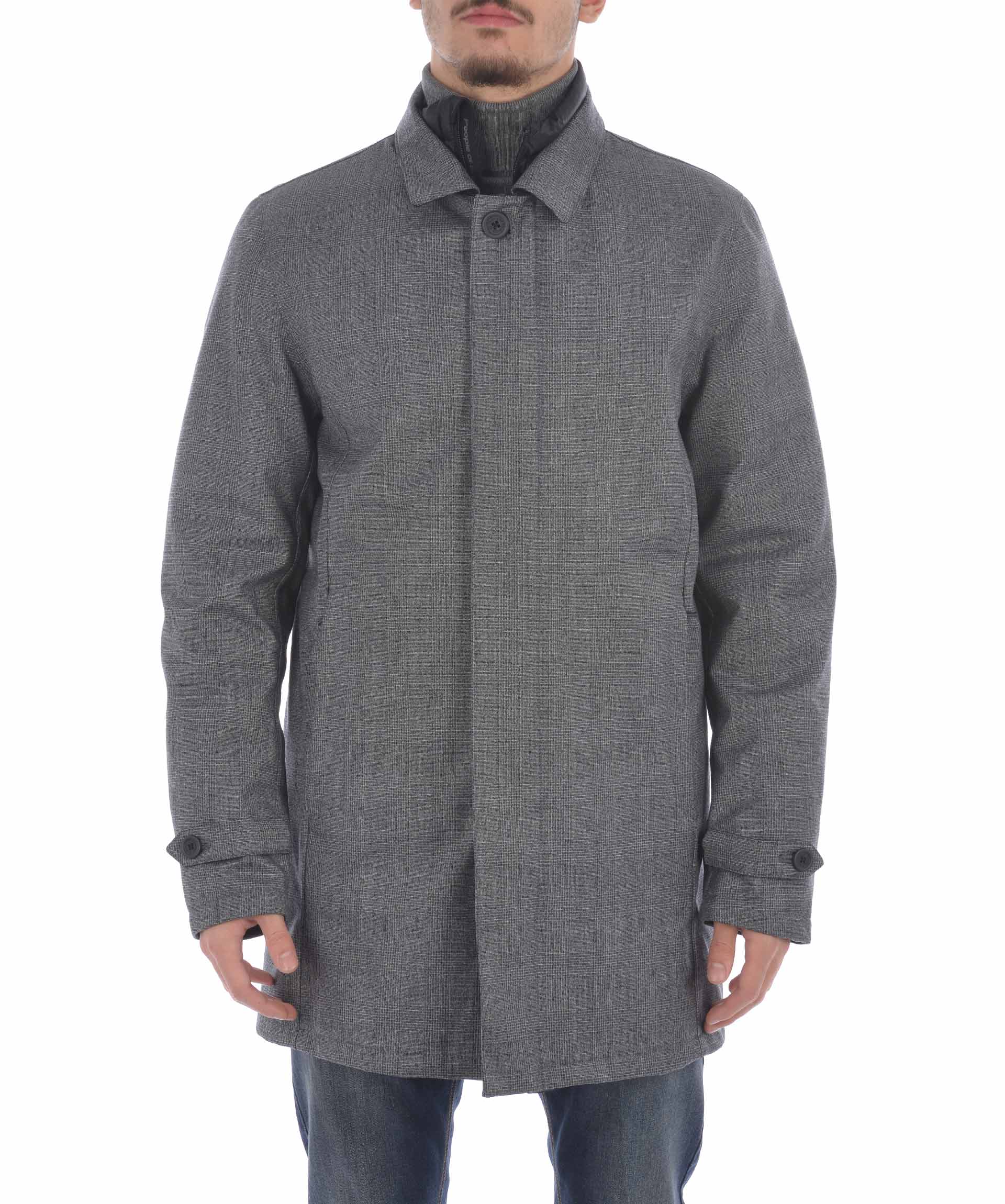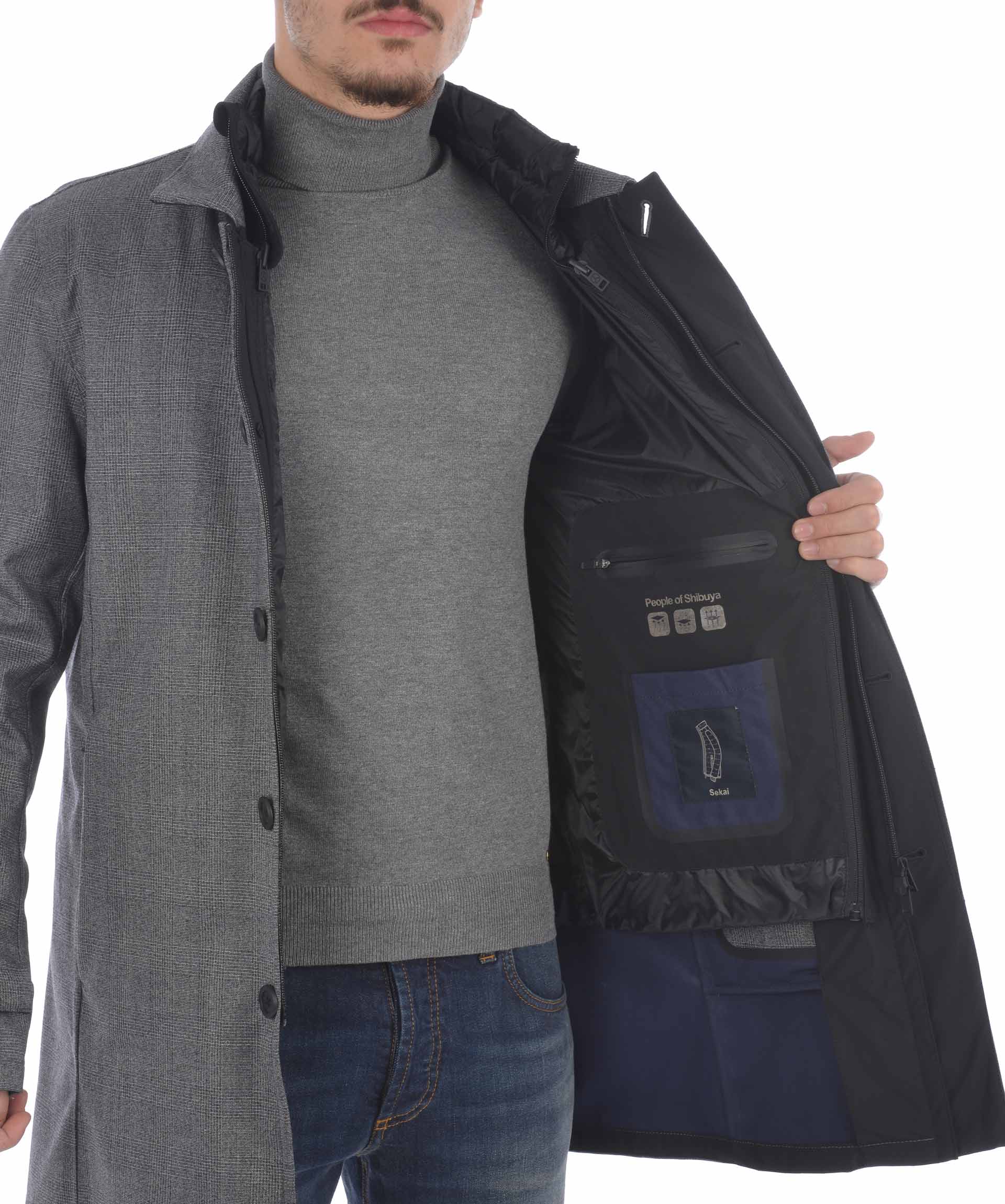 Giaccone People of Shibuya in tela di misto lana principe di galles Grigio scuro . Antipioggia, traspirante. Colletto classico. Chiusura con doppia zip e bottoni coperti da fintone. Tasche frontali con zip. Mostrine ai polsi con bottone ed inserto catarifrangente. Spacco centrale sul retro. Foderato con piumino Nero trapuntato staccabile, imbottito con piume d'oca, tasche con zip e tasche interne, polsini in maglia a costine.